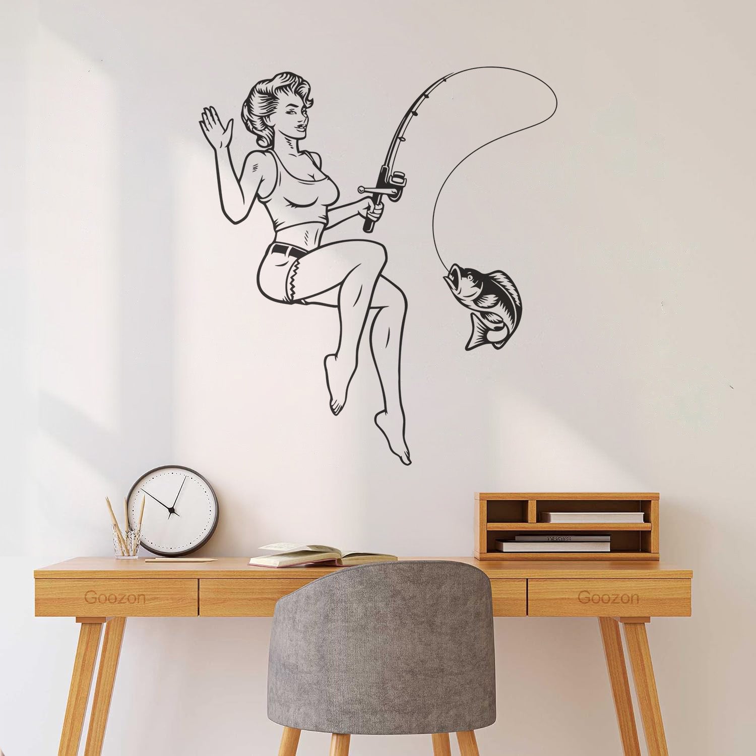 Fisher Pin Up Appeal Woman Fishing Catching Fish Wall Decals Personalized Customization